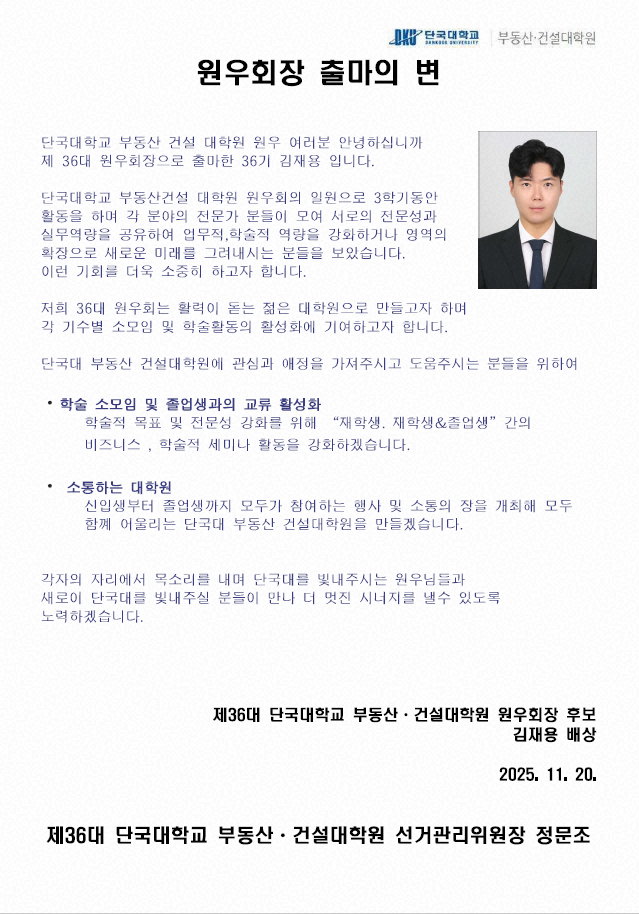 | 36대 원우회장 후보 출마의 변(수정)- 36기 김재용 후보 | |