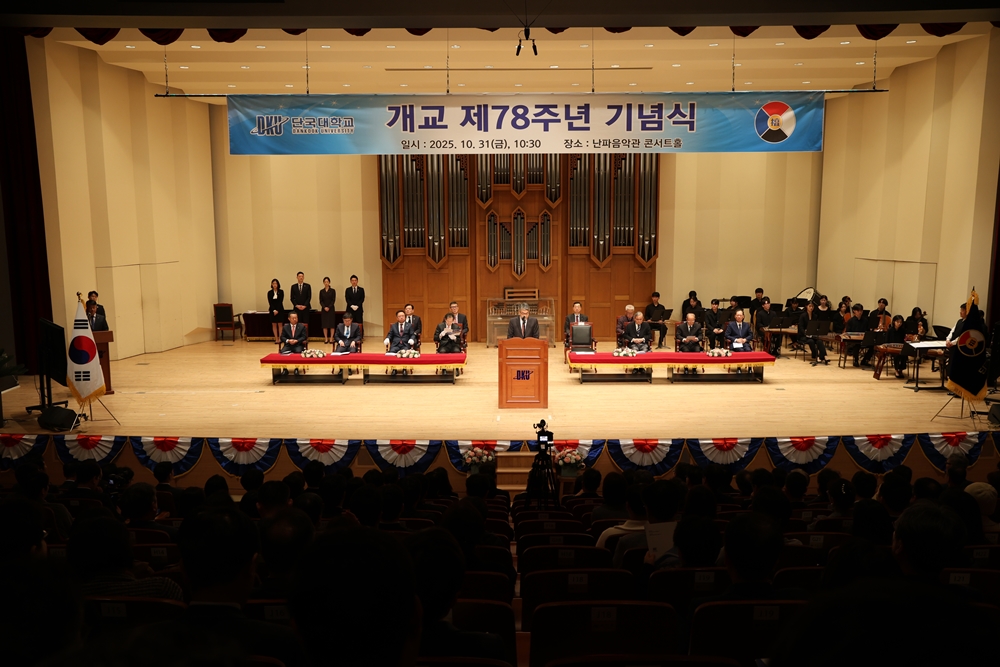 우리 대학은 31일(금) ‘개교 78주년 기념식’과 ‘범정 장형 선생 61주기·혜당 조희재 여사 78주기 합동 추모식’을 개최하고 민족사학으로서의 정체성을 되새기며 창학 100주년을 향한 혁신 의지를 다짐했다. 범정 장형 선생 61주기 및 혜당 조희재 여사 78주기 합동 추모식 이날 오전 난파음악관 리사이트홀에서는 설립자 범정 장형 선생과 혜당 조희재 여사의 합동 추모식이 열렸다. 장호성 이사장, 장충식 명예이사장 및 안순철 총장을 비롯한 대학 관계자, 교무위원, 설립자 유족, 학생대표 등이 참석해 설립자를 추모하고 숭고한 창학이념을 되새기는 시간을 가졌다.  ▲장호성 이사장이 설립자 합동 추모식에서 제문 봉독을 하고 있다. 개교 78주년 기념식, 미래를 선도하는 지속 가능한 대학 다짐  ▲난파음악관 콘서트홀에서 열린 개교 78주년 기념식 전경 난파음악관 콘서트홀에서 열린 개교 78주년 기념식에는 법인, 대학 관계자, 표창 수상자 등 600여 명이 참석했다. 참석자들은 78년의 발자취를 돌아보며 '미래를 선도하는 지속 가능한 대학'으로의 도약을 다짐했다. 대학 연혁 보고에서는 범정 선생 서거 60주기와 광복 80주년을 기념해 제작된 대학 역사 다큐멘터리 「단국, 여기 한 개의 글집을 세우다」가 상영돼 독립운동가이자 설립자인 범정 장형 선생의 독립운동과 단국대학 설립 과정을 조명했다.  ▲장호성 이사장이 개교기념사를 하고 있다. 장호성 이사장은 기념사에서 "교육과 연구환경 개선에 헌신해 온 대학 구성원들에게 감사드린다"며 "변화와 혁신을 통해 미래를 선도하는 단국의 비전을 실현하겠다"고 밝혔다.  ▲안순철 총장이 기념 식사를 하고 있다. 안순철 총장은 “78년의 전통 위에 선 단국이 이제 풍성한 열매를 맺어야 할 때”라며 “개교 80주년이 되는 2027년까지 핵심 가치를 확립하고 창학 100주년을 향한 중장기 발전계획 수립을 추진하겠다”라고 밝혔다.  ▲고정용 총동창회장이 축사를 하고 있다. 고정용 총동창회장은 "2년 연속 대학혁신지원사업 S등급 획득은 단국의 확고한 역량을 보여주는 성과"라며 “동문이 모교 발전을 견인하고 모교의 성취가 다시 동문의 자부심이 되는 선순환의 역사를 만들어 가겠다”고 말했다. 이날 기념식에서는 10년·20년·30년 근속 교직원과 대학 발전에 기여한 교직원에 대한 시상도 진행됐다.  ▲개교기념식 수상자 기념 촬영 장면 개교 78주년을 기념해 우리 대학은 역사와 전통성을 조명하는 다양한 부대 행사들도 개최했다. 「중재 평전」 에 담긴 단국의 역사…중재 장충식 명예이사장의 삶과 헌신 조명  ▲개교 78주년 기념 '중재 평전'에 담긴 단국의 역사 행사 기념 사진 단국역사관 컨벤션홀에서는 개교 78주년을 기념해 「중재 평전」에 담긴 단국의 역사를 조명하는 행사가 열렸다. 독립운동가의 아들이자 단국인으로 대학의 발전을 이끈 중재 장충식 명예이사장의 삶과 헌신을 조명하는 자리로, 평전은 김학준 석좌교수가 집필했다. 김학준 석좌교수는 "장충식 명예이사장은 평생을 영광보다 희생과 헌신으로 단국의 발전을 이끌어 왔다”라며 “중재평전을 통해 후학들이 장충식 명예이사장의 봉사와 헌신, 민족과 인류를 향한 사랑을 실천하길 바란다”라고 밝혔다.  ▲장충식 명예이사장이 행사에서 헌신과 사랑으로 걸어온 60여 년의 교직 인생을 회고하고 있다. 장충식 명예이사장은 “32세에 대학 경영을 맡은 뒤 정치적 영향에 흔들리지 않는 대학을 만들겠다는 신념으로 학생들을 나라의 버팀목이 될 인재로 키워왔다”며 “중재 평전을 집필해 준 김학준 석좌교수께 감사드린다”고 밝혔다.  ▲장충식 명예이사장(왼쪽)이 아마레앙상블과 함께 바이올린 연주를 하고 있다. 이날 상영된 기념 영상 「시대를 넘어 미래를 열다―단국의 큰 스승, 중재 장충식」은 장충식 명예이사장의 청년기, 대학 발전 과정, 세계 평화와 스포츠 업적 등을 담아 의미를 더했다. DKU아너스센터, 학술에세이 경진대회 및 토크콘서트 개최 ▲DKU아너스센터는 광복80주년과 개교 78주년을 기념해 '민족사학 단국대학교의 과거와 미래' 토크콘서트를 진행했다. DKU아너스센터는 광복 80주년과 개교 78주년을 기념해 ‘민족사학 단국대학교의 과거와 미래’ 토크콘서트와 학술에세이 경진대회를 열었다.  ▲장유정 원장이 학생들에게 독립운동 노래 변천사에 대해 설명하고 있다. 장유정 문화예술대학원장은 오프닝 무대에서 직접 작사·작곡한 '경성야행','작은 바람의 노래'를 선보이며 항일 음악의 의미를 전하고 대한제국 시기의 '아리랑'과 '거국행' 등 독립운동 노래의 변천사를 흥미롭게 풀어냈다.  ▲(왼쪽부터)박성순 단국역사관장이 김희곤 국립대한민국임시정부기념관장·한시준 명예교수(前독립기념관장)와 '독립운동가와 단국대학교 다시, 도전과 창조를 논하다' 토크콘서트를 진행하고 있다. 이어 박성순 단국역사관장의 사회로 진행된 토크콘서트에서는 한시준 명예교수(前독립기념관장, 사학과)과 김희곤 국립대한민국임시정부기념관장이 패널로 나서 임시정부와 단국대의 연관성 및 단국대가 미래 사회에서 계승할 가치와 방향에 대해 논의를 펼