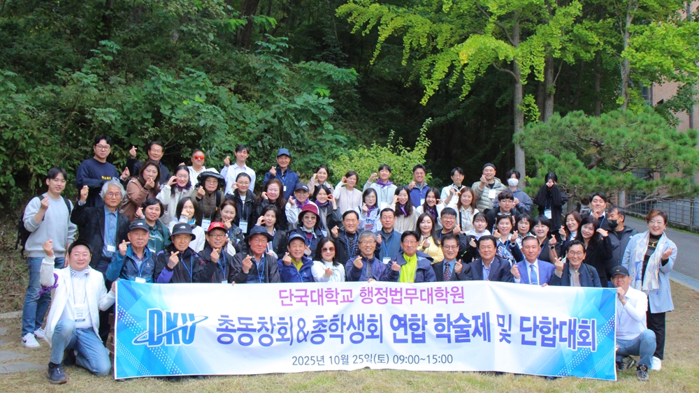 졸업생과 재학생이 한마음으로 소통·화합·장학기부의 장 열어 총동창회, 장학금 350만 원 기부 “후배 사랑으로 선순환 문화 이끌 것” 행정법무대학원(원장 양만식)이 지난 25일(토) 죽전캠퍼스에서 ‘총동창회 & 학생회 연합 학술제 및 단합대회’를 개최했다. 이번 행사는 행정법무대학원 개원 이래 처음으로 총동창회와 학생회가 공동으로 마련한 학술 교류의 장으로, 졸업생과 재학생 150여 명이 참석해 세대 간 교류와 화합의 시간을 가졌다.  ▲ 행정법무대학원은 개원 이래 처음으로 총동창회와 학생회가 공동으로 연합 학술제 및 단합대회를 열고 기념 촬영을 했다. 이날 행사에는 양만식 행정법무대학원장, 최철응 총동창회장, 전인복 총학생회장, 각 학과 주임교수 및 총동창회 임원, 재학생 및 졸업 동문 등이 함께했다. 행사는 법화산 등반과 장학증서 전달식, 특강, 캠퍼스 투어 등 다채로운 프로그램으로 진행됐다. 특히 오성남 교수(前 국립환경과학원 지구환경연구소장)가 ‘기후변화의 과거와 현재, 그리고 인류의 건강사회’를 주제로 특강을 진행해 참석자들의 큰 호응을 얻었다. 오 교수는 특강을 통해 기후 위기 시대에 필요한 인간 중심의 환경 정책과 건강한 사회의 방향을 제시했다. 오후에는 죽전캠퍼스 단국역사관과 석주선기념박물관을 탐방하는 캠퍼스 투어가 이어졌으며, 참석자들은 단국의 역사와 정체성을 되새기며 선후배 간의 유대를 다졌다.  ▲ 행정법무대학원 총동창회는 후배사랑을 실천하기 위해 장학기금을 기탁했다.  ▲ 행정법무대학원 ‘총동창회 & 학생회 연합 학술제 및 단합대회’ 기념 사진 이번 행사에서 총동창회는 모교 발전과 후배들의 학업 지원을 위해 총 350만 원의 장학금을 기부했다. 장학금은 박용석 원생(행정학과 25학번) 등 총 8명의 원생에게 지급됐다. 최철응 총동창회장은 “졸업생과 재학생이 한마음으로 단국의 정신을 이어가는 자리가 되어 뜻깊다”라며 “앞으로도 후배 사랑과 학문적 교류의 전통을 이어가겠다”고 전했다. 양만식 원장은“이번 연합 학술제는 졸업생과 재학생이 한자리에 모여 학문적 교류와 인적 네트워크를 이어가는 뜻깊은 자리”라며 “앞으로 행정법무대학원은 학문과 실무를 아우르는 전문 교육기관으로 선후배가 함께 소통하고 성장하는 학문공동체로 발전시킬 계획이다”라고 밝혔다.