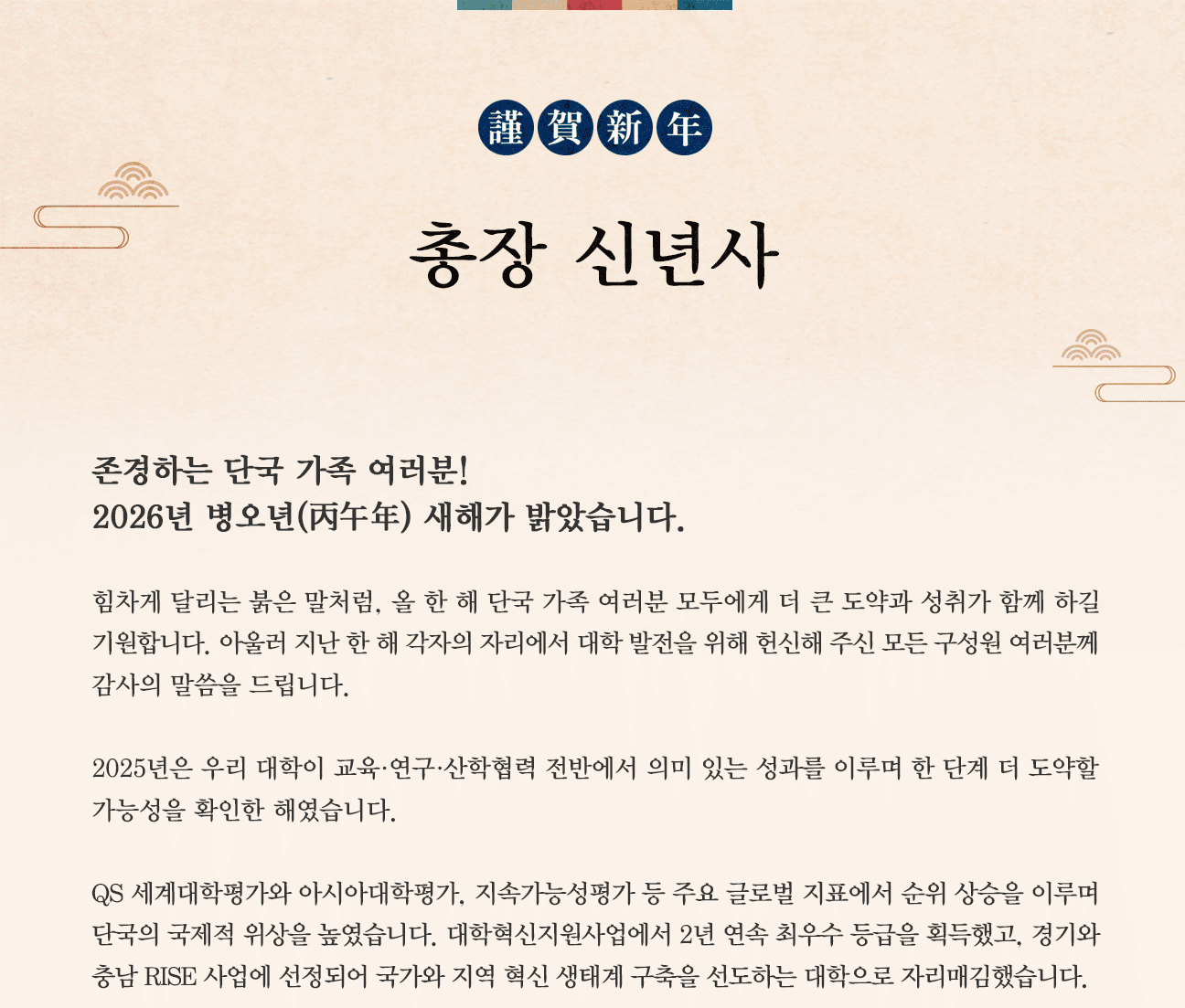 1월 2일, 죽전캠퍼스 혜당관 학생극장에서 개최된 '2026년도 신년하례 및 시무식' 행사에 참석하여 교직원들과 신년 인사를 나누었다. 안순철 총장은 신년사를 통해 지난 한 해는 우리 대학이 교육과 연구, 산학협력 전반에서 의미 있는 성과를 이루며 도약의 가능성을 확인한 해였다고 평가하며, 각자의 자리에서 대학 발전을 위해 헌신해 주신 단국 가족분들께 감사의 인사를 전하였다. 그리고, 2026년 병오년(丙午年) 새해를 '창학 100년 단국'을 향한 대장정을 본격적으로 시작하는 해라고 밝히며, 변화와 혁신을 통해 미래 경쟁력을 한 단계 끌어올리자고 강조했다.