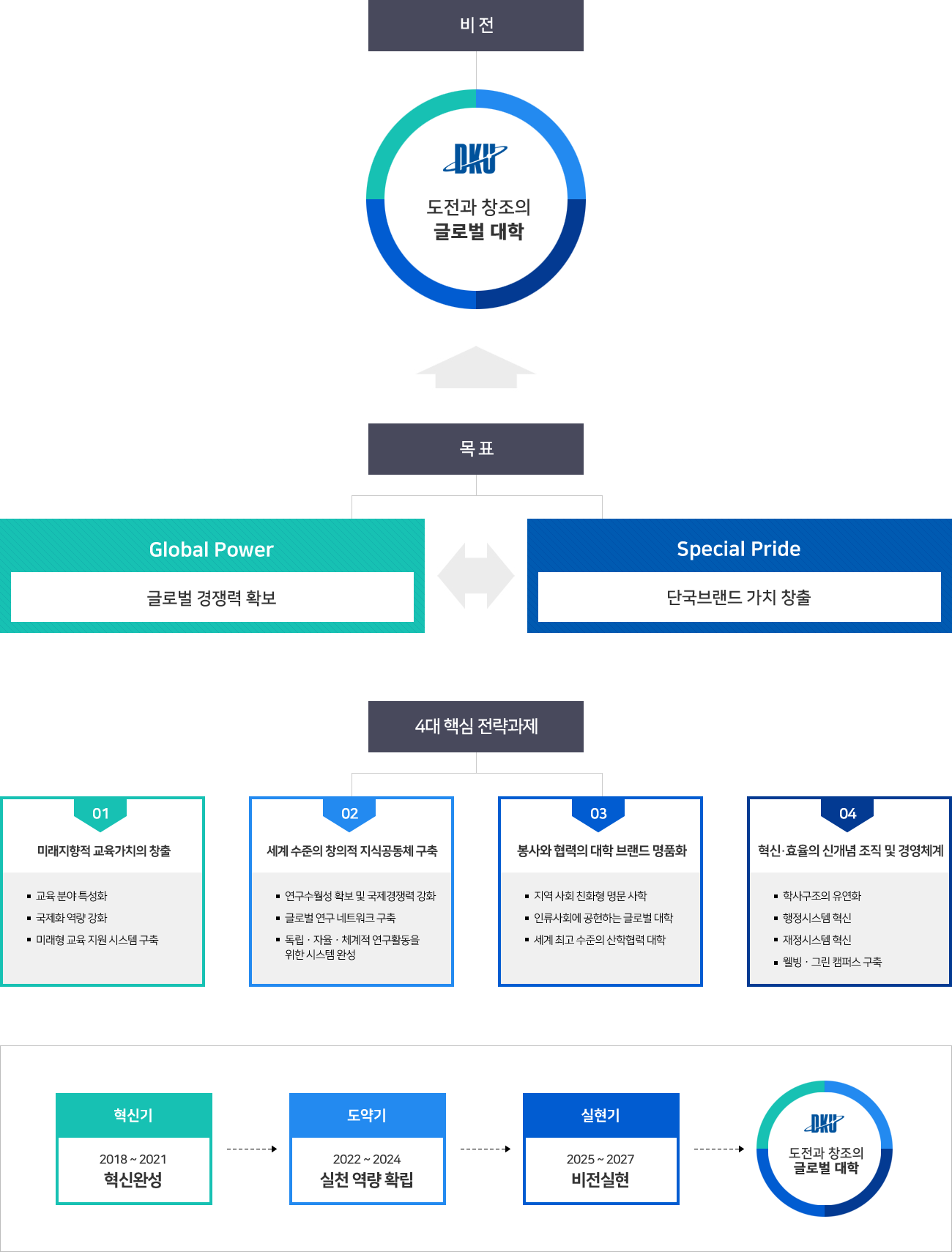 우리대학은 대학특성화를 통해 글로벌화 및 4차 산업혁명에 대응하며, 미래 사회를 선도적으로 개척하고 창조적 사고로 인류사회 발전에 기여하는 능동적 인재, 혁신적 인재, 헌신적 인재를 양성하여 우리대학의 창학이념 및 교육목표를 구현하고자 한다.
